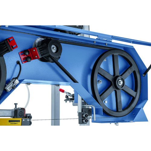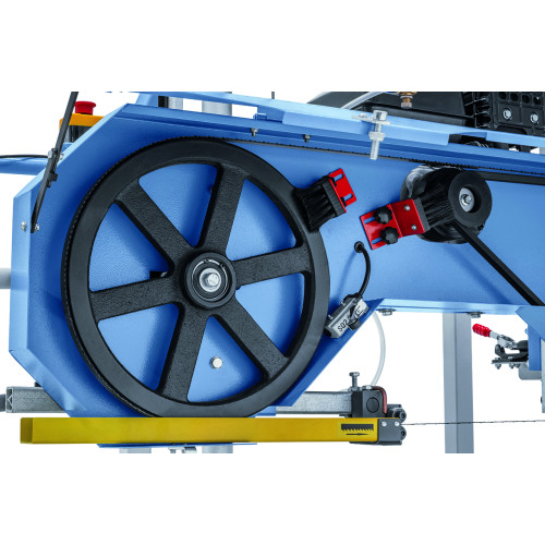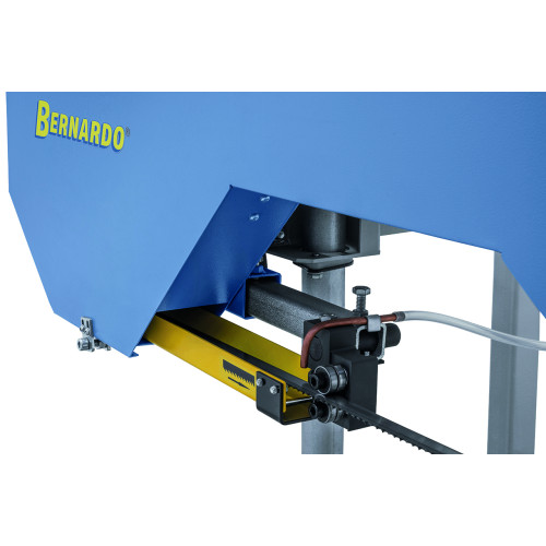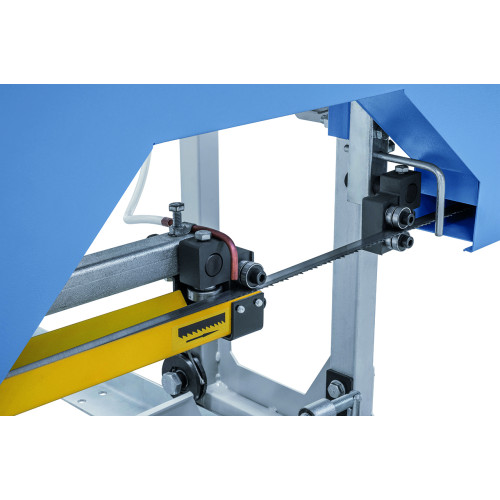 Машината за рязане се доставя с резервоар за охлаждаща течност и дозиращ вентил, които осигуряват оптимално смазване и охлаждане на лентата по време на работа, удължавайки нейния живот. Регулируемите ограничители позволяват лесно и сигурно фиксиране на трупите върху рамата.