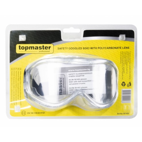 Предпазните очила TOPMASTER SG03 са модел от затворен тип, който предлага надеждна защита и модерен спортен дизайн с отлично прилепване към лицето. Продуктът разполага с поликарбонатен визьор и мека, еластична рамка, изработена от винил, която осигурява комфорт по време на носене. В рамката са интегрирани отвори за директна вентилация, подобряващи циркулацията на въздуха и намаляващи възможността за запотяване. Допълнително удобство е възможността моделът да се носи върху диоптрични очила.