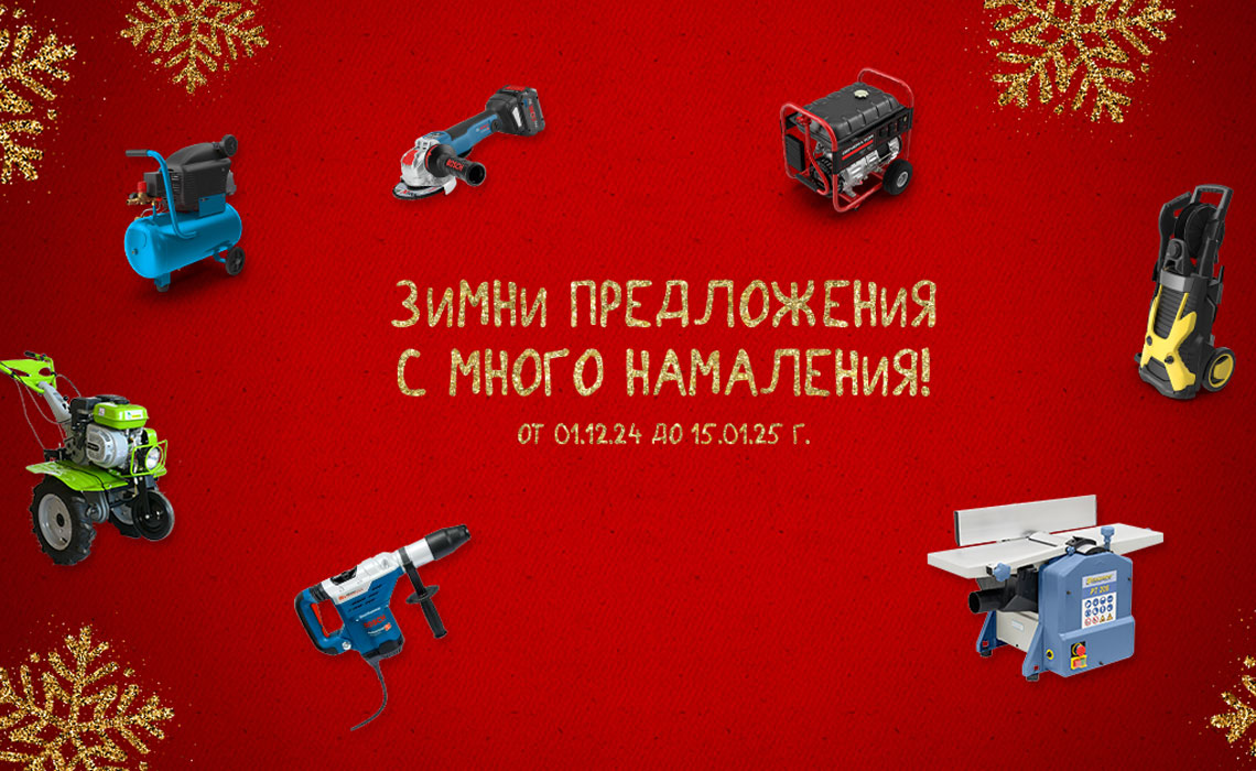 Само до 15 януари имаш възможност да закупиш супер изгодно стотици машини и инструменти - електроинструменти, дървообработващи и металообработващи машини, градинска техника, генератори, малогабаритна техника, компресори, строителни машини, водни помпи, ВиК техника, колонки и резервоари за дизелово гориво, зарядна и заваръчна техника, стълби и още много други!