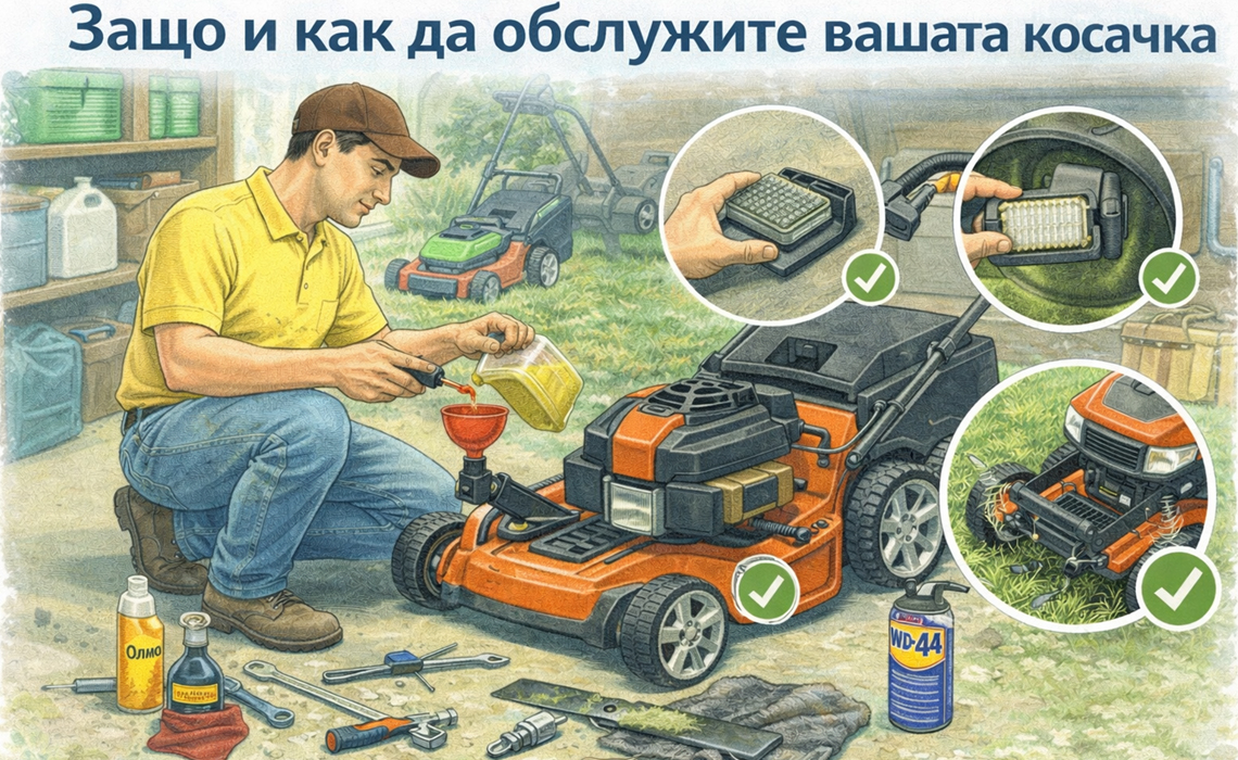 В статията ще разгледаме защо поддръжката е важна (безопасност, дълготрайност, ефективност, икономия и т.н.), кога да я правите (сезонен график и моточасове), стъпките за самостоятелно обслужване на бензинови, електрически и роботизирани косачки, необходими инструменти, сравнение „направи си сам” срещу сервиз, ориентировъчни разходи и план за екологично управление.