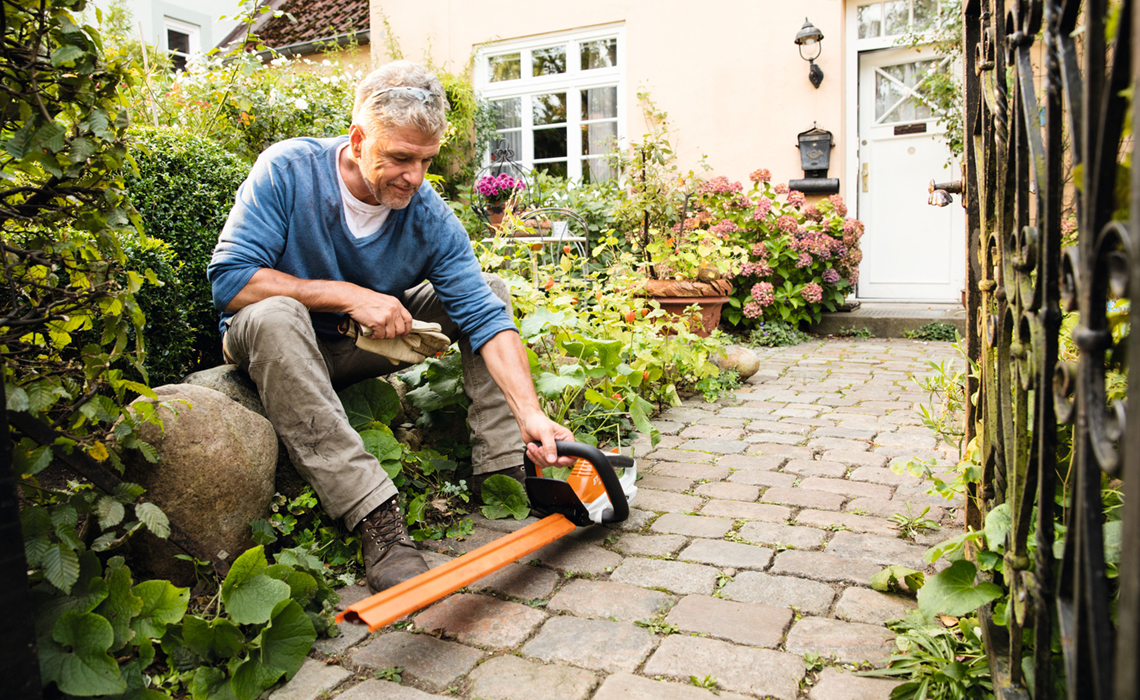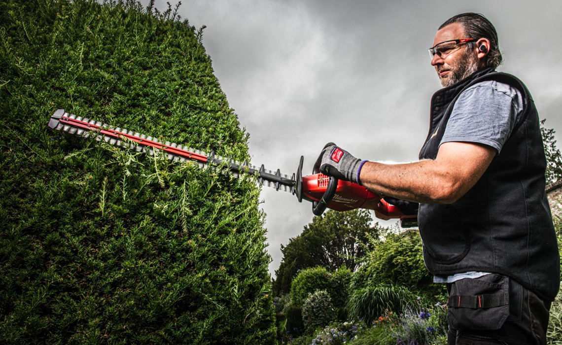 Висок плет около имот или обекти: телескопичен/прътов храсторез, който позволява работа от земята, значително намалява риска от падане и ускорява работата по вертикални стени на плета.