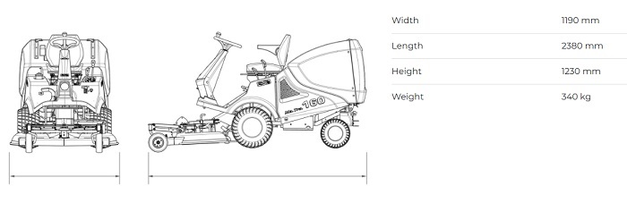 Това е косачка за трева с ширина на косене 113 cm, управлявана с бутон, позиционирана така, че да имате перфектен изглед към работната зона. Височината на косене се регулира от 30-90 mm, директно от седалката на водача с помощта на лост със 7 различни позиции. Режещият модул може да се трансформира в мулчиращ, с помощта на комплект за мулчиране (купува се отделно). Тракторът за косене е оборудван с 300 литров контейнер, който посредством бутон на седалката се накланя за изпразване на окосената трева, с автоматично затваряне, и с дросел уплътняващ тревата вътре в него. Когато коша се напълни, остриета спират автоматично, за да се предотврати запушване. BCS Ma.Tra. 160 има два противоположно въртящи се ножа и преден малък нож, които създават принудителна вентилация на въздушно-тревния поток. Поддръжката и почистването се улесняват от вертикалното положение на косачката. Двигателят е Briggs&Stratton Vanguard V-Twin, 15 к.с, 479 куб.см.